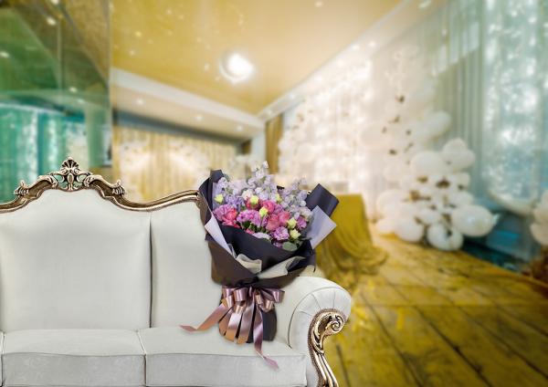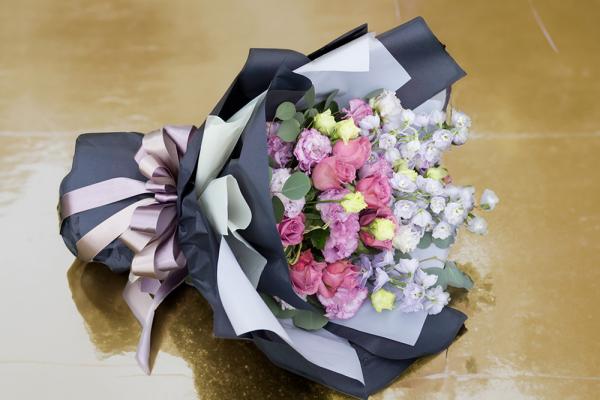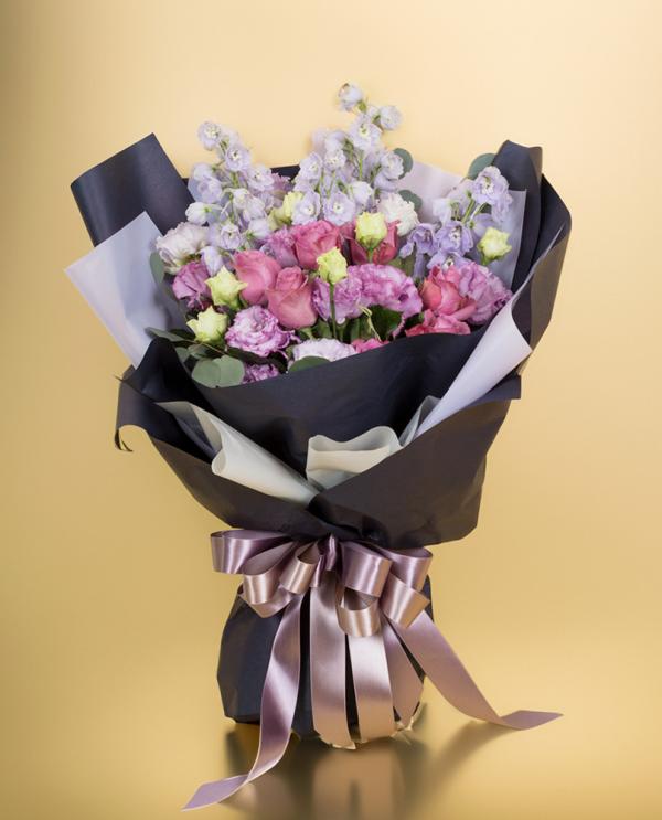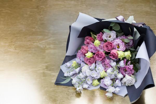 紫バラのお祝い花束